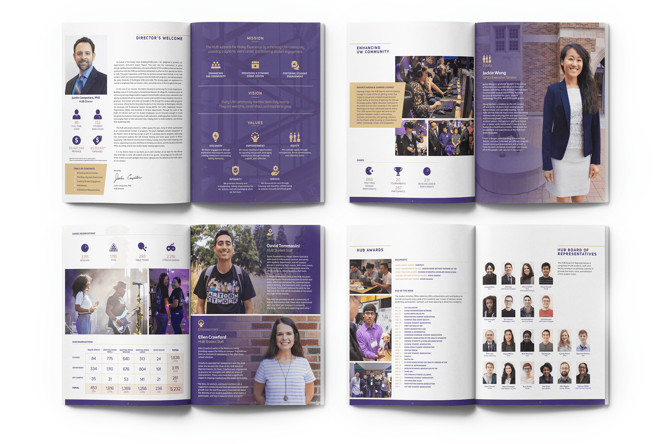 During my time working for the HUB, I got to design the 2018-2019 annual report in a new format of a zine in order to set the precedent for upcoming years' impact reports. This process involved gathering data, images, and writing from respective organizations within the HUB, and turning that information into a comprehensive and compelling report that reflects student life at the HUB.
