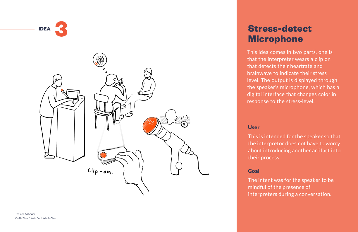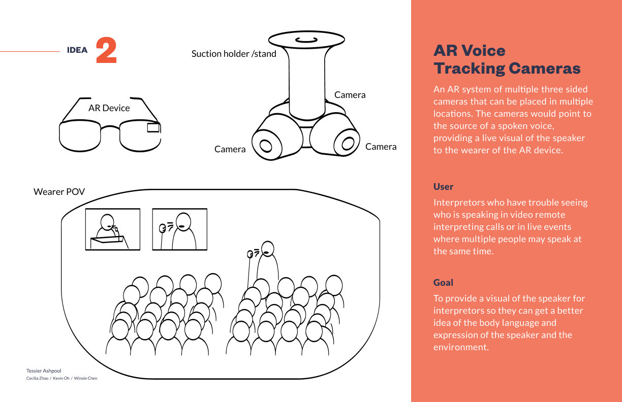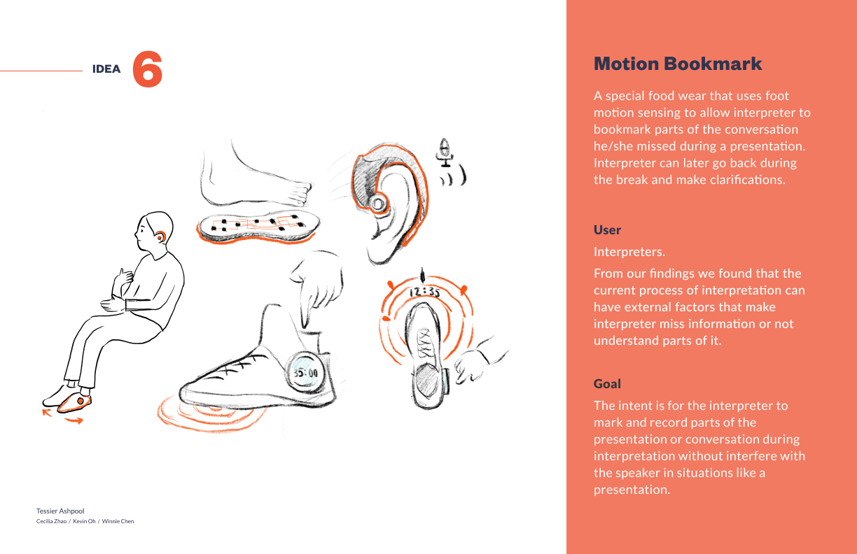 After doing several ideation sprints our team narrowed down to six ideas. Of those six, we ultimately decided to explore idea 5 because we thought it was a nonintrusive intervention that was the closest to align with our principles and our goal of assisting interpreters despite the speculative nature of the AR and AI technology.