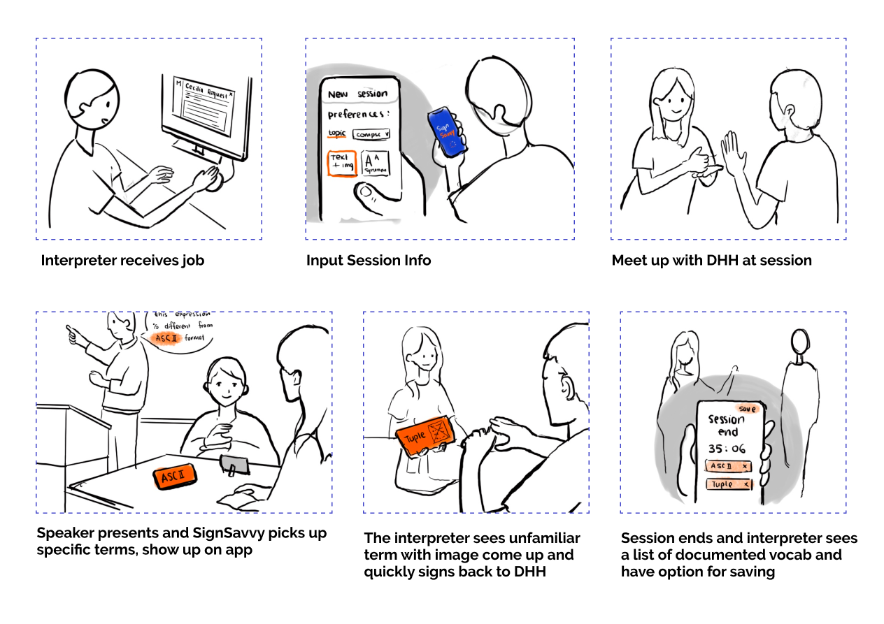 The most valuable takeaway from this project is not coming up with a cool product or design. It is how much I was able to learn from diving into an unfamiliar topic which was deaf culture, sign language, and interpreters. I got to learn about how others navigate and interact with the world differently. I also grew to love interpreters not just for how well they handle their difficult job but more for their passion and dedication for accessibility and inclusion to DHH people. Because I learned more about deaf culture and DHH people, I have the perspective to look into their world and be a more knowledgable and empathetic designer and person.