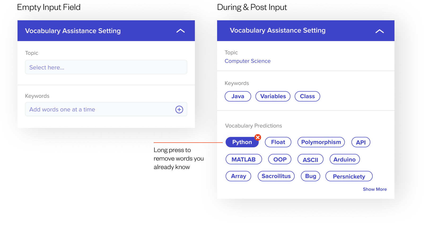 When interpreters input the topic and keywords they know before the session, the AI will generate a list of vocabulary that might occur in the session. They can remove words they already know from this list. This would help the AI identify the interpreter’s vocabulary level and decide which terms to highlight during the session.